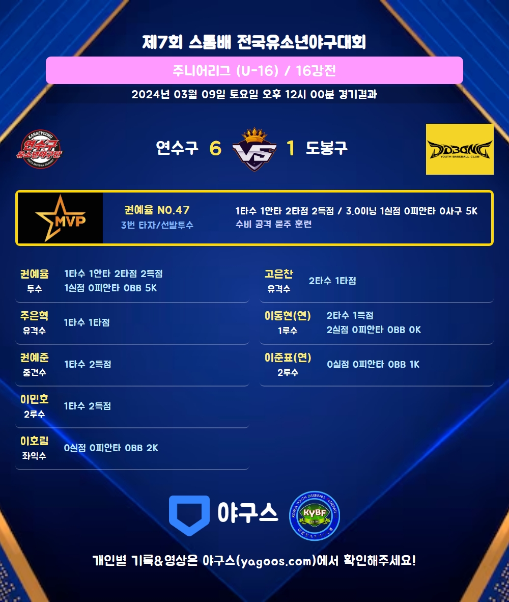 | 3 | 투 | 권예율(47) | 우월3 | 4구 | - | 4구 | 1 | 1 | 2 | 2 | 0 | 0 | 2 | 0 | 1.000 |