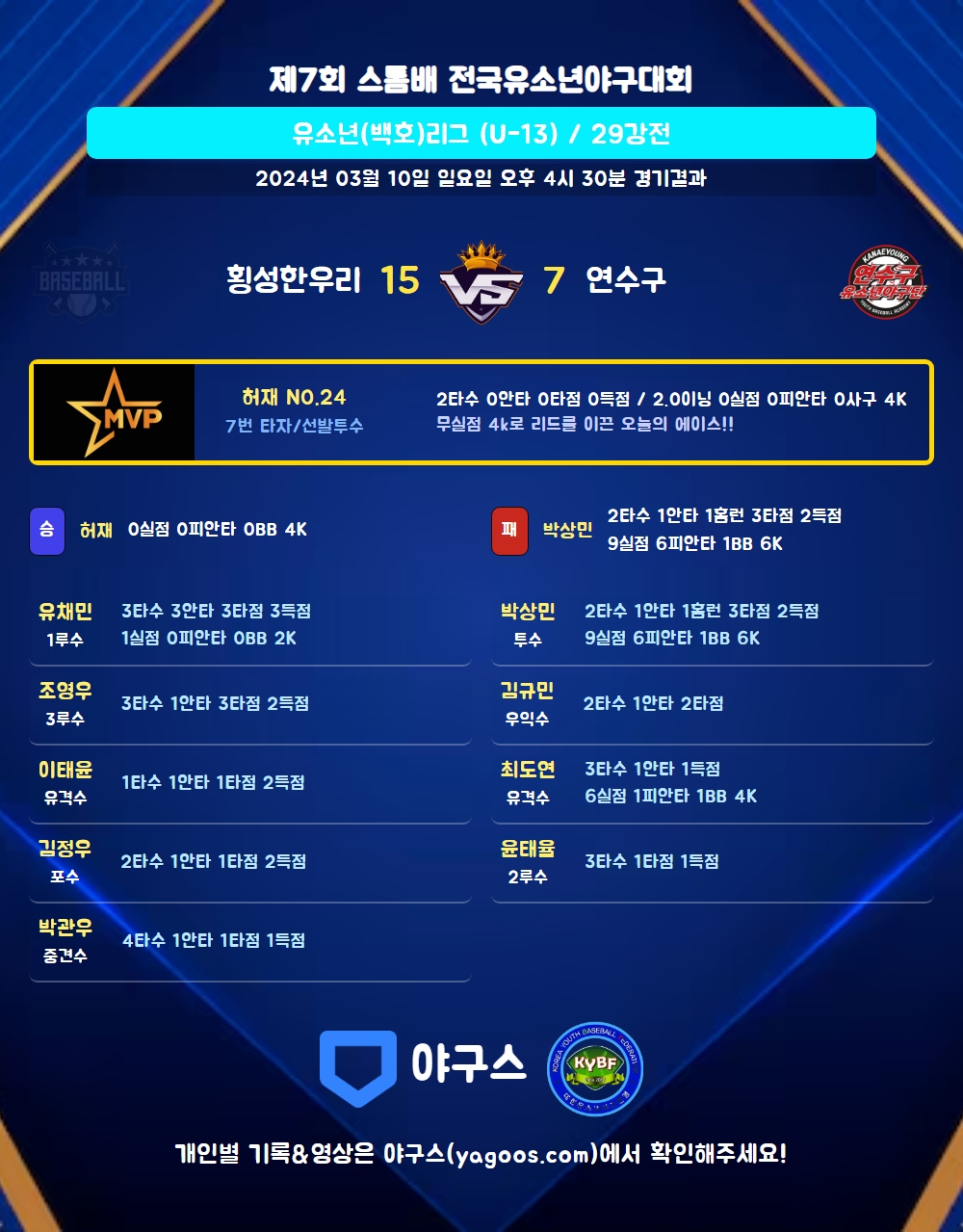| 3 | 유 | 최도연(11) | 유플 | - | 중전안 | 삼진 | 3 | 1 | 0 | 1 | 0 | 0 | - | 1 | 0.333 |