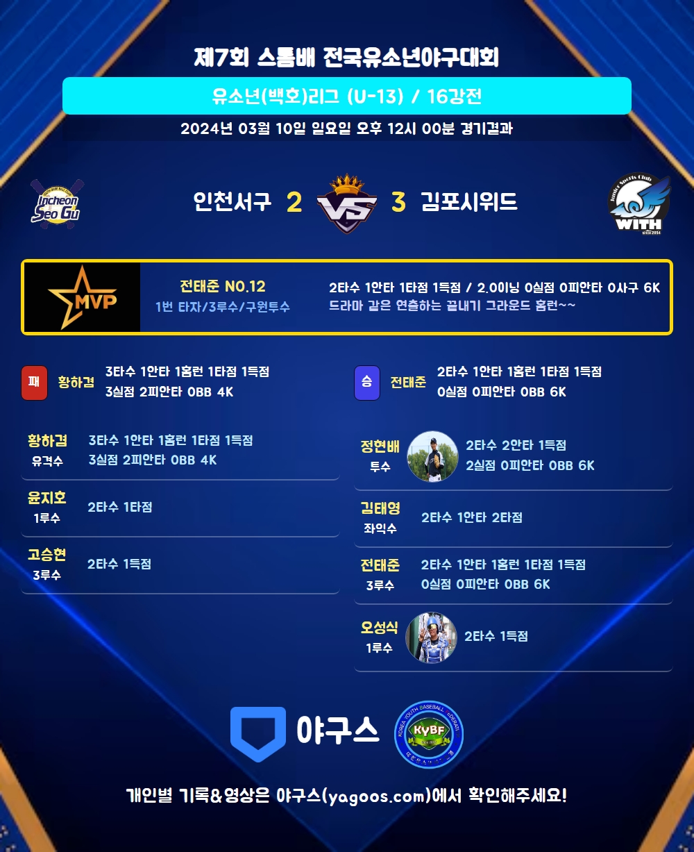 | 2 | 전태준(12) | 승 | - | 6 | 0 | 0 | 0 | - | 6 | 22 | 0 | 0 | 0.00 |