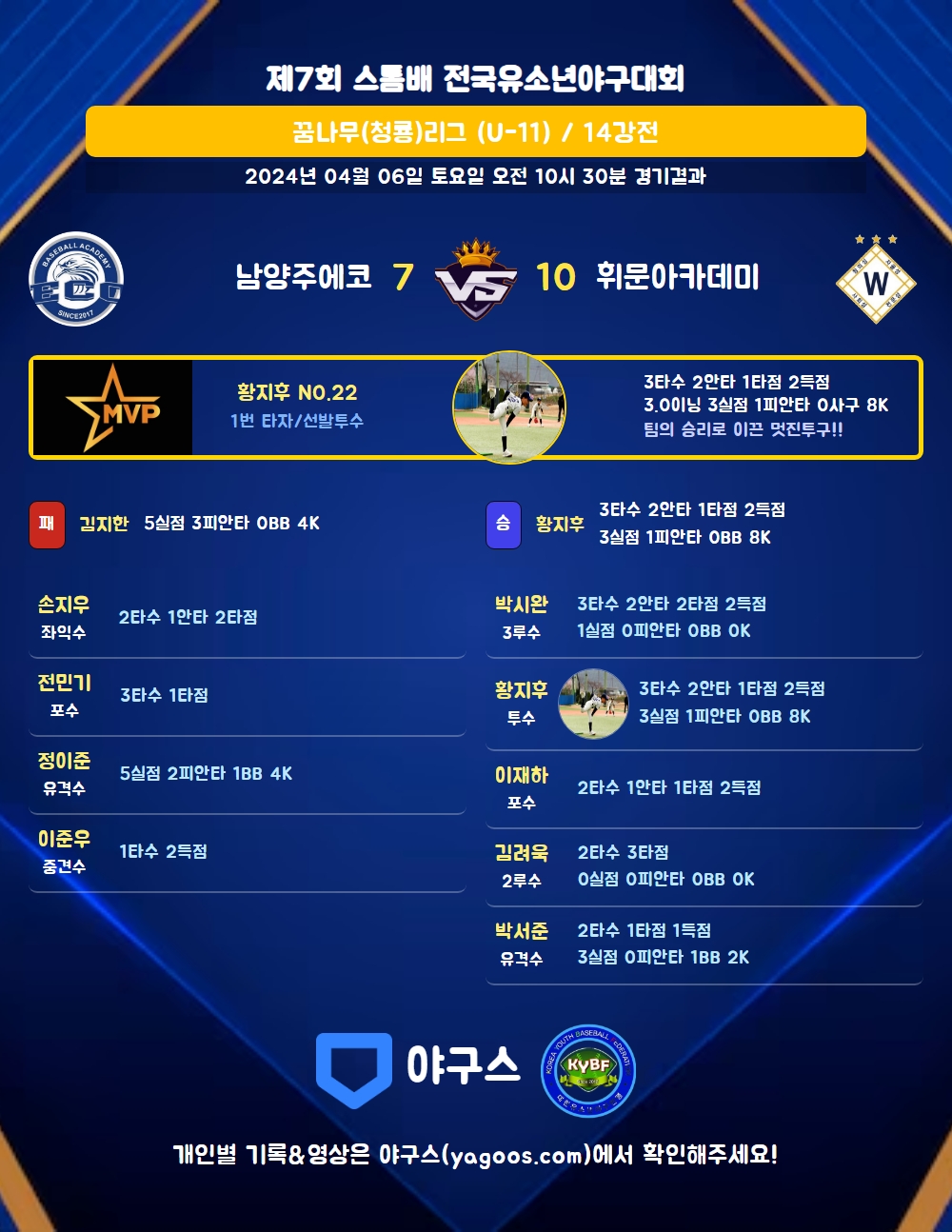 | 1 | 황지후(22) | 승 | - | 16 | 1 | 1 | 0 | 6 | 8 | 68 | 3 | 3 | 500.00 |