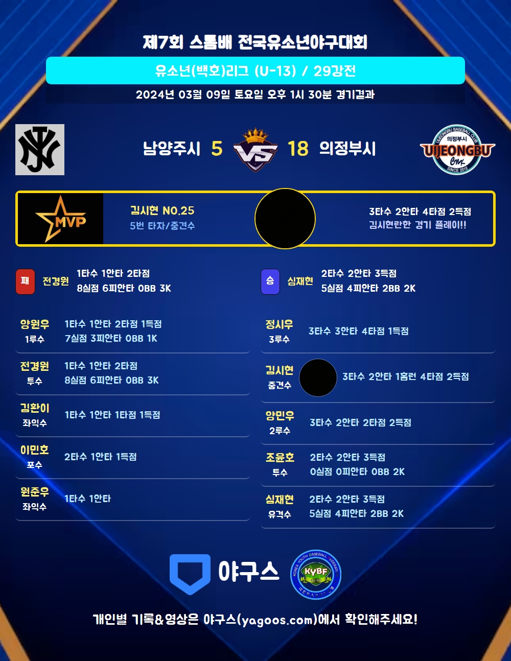 | 6 | 유 | 심재현(87) | 중전안 | 우전3,4구 | - | 2 | 2 | 0 | 3 | 0 | 1 | 1 | 0 | 1.000 |
