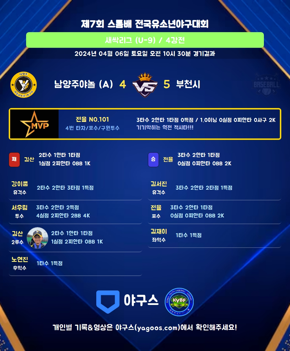 | 5 | 三 | 곽준후(103) | - | 4구 | 4구 | 4구 | 0 | 0 | 0 | 2 | 0 | 0 | 3 | 0 | 0.000 |