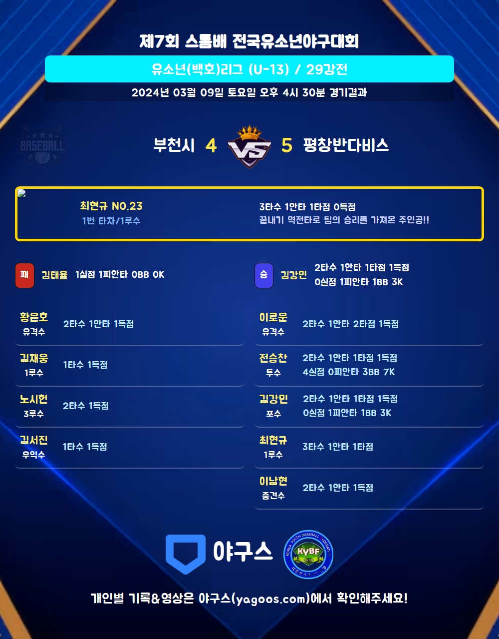 | 평창반다비스 | 0 | 0 | 0 | 4 | 1 | 5 | 5 | 3 | 1 |