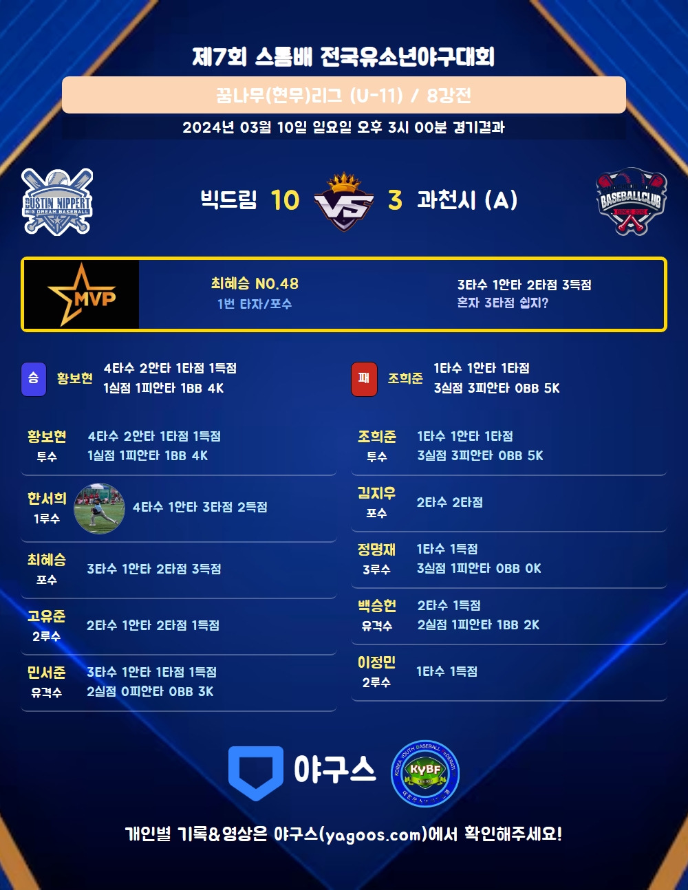 | 2 | 유 | 민서준(63) | 좌전2 | 삼진 | - | 3실 | 사구 | - | 3 | 1 | 1 | 1 | 0 | 1 | 1 | 1 | 0.333 |