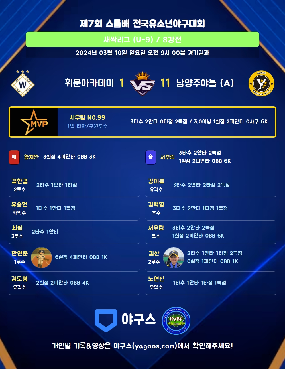 | 남양주야놀 (A) | 3 | 0 | 0 | 8 | 0 | 11 | 10 | 2 | 5 |