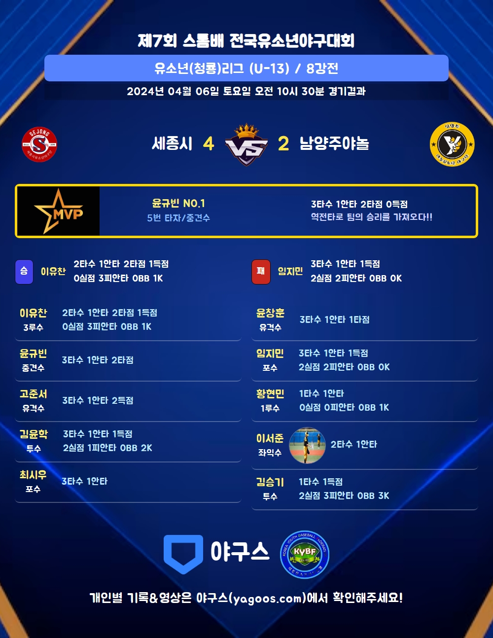 | 6 | 포 | 최시우(17) | 우전안 | - | - | 2플 | 2땅 | 3 | 1 | 0 | 0 | 0 | 0 | - | 0 | 0.333 |
