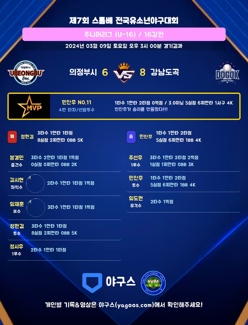 | 1 | 민찬우(11) | 승 | - | 17 | 6 | 6 | 0 | 3 | 4 | 58 | 5 | 5 | 1,166.00 |