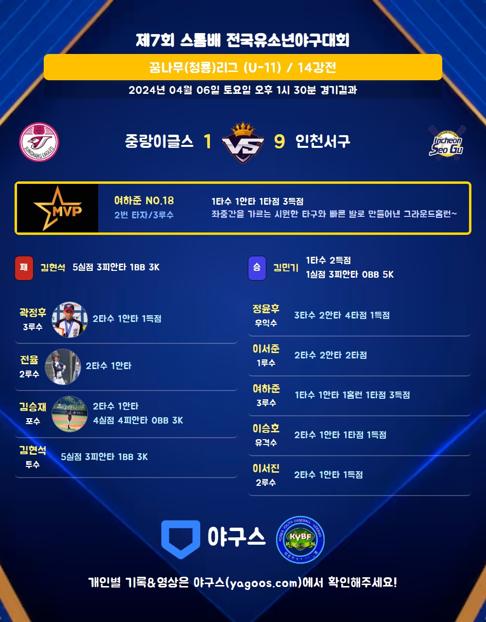 | 4 | 우 | 정윤후(47) | 우전2 | - | 삼진 | 중전2 | 3 | 2 | 4 | 1 | 0 | 0 | - | 1 | 0.667 |