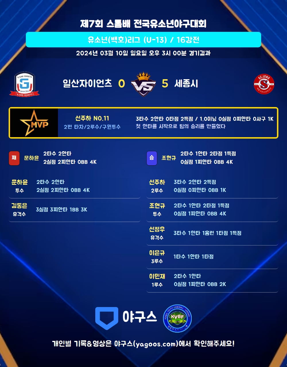 | 일산자이언츠 | 0 | 0 | 0 | 0 | 0 | 0 | 2 | 0 | 0 | |