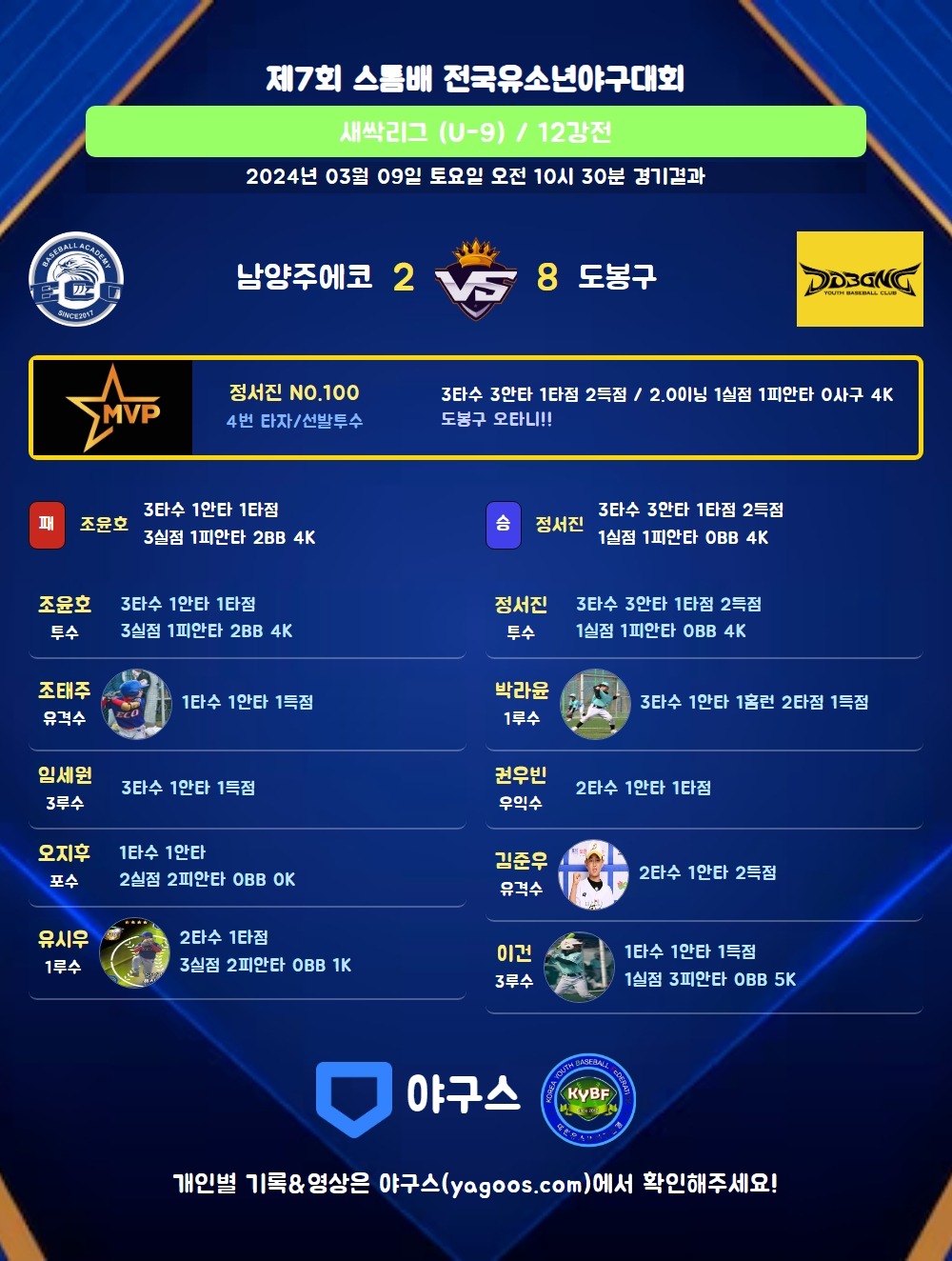 | 9 | 우 | 권우빈(22) | - | 포땅 | 투내안 | - | 2 | 1 | 1 | 0 | 0 | 0 | - | 0 | 0.500 |
