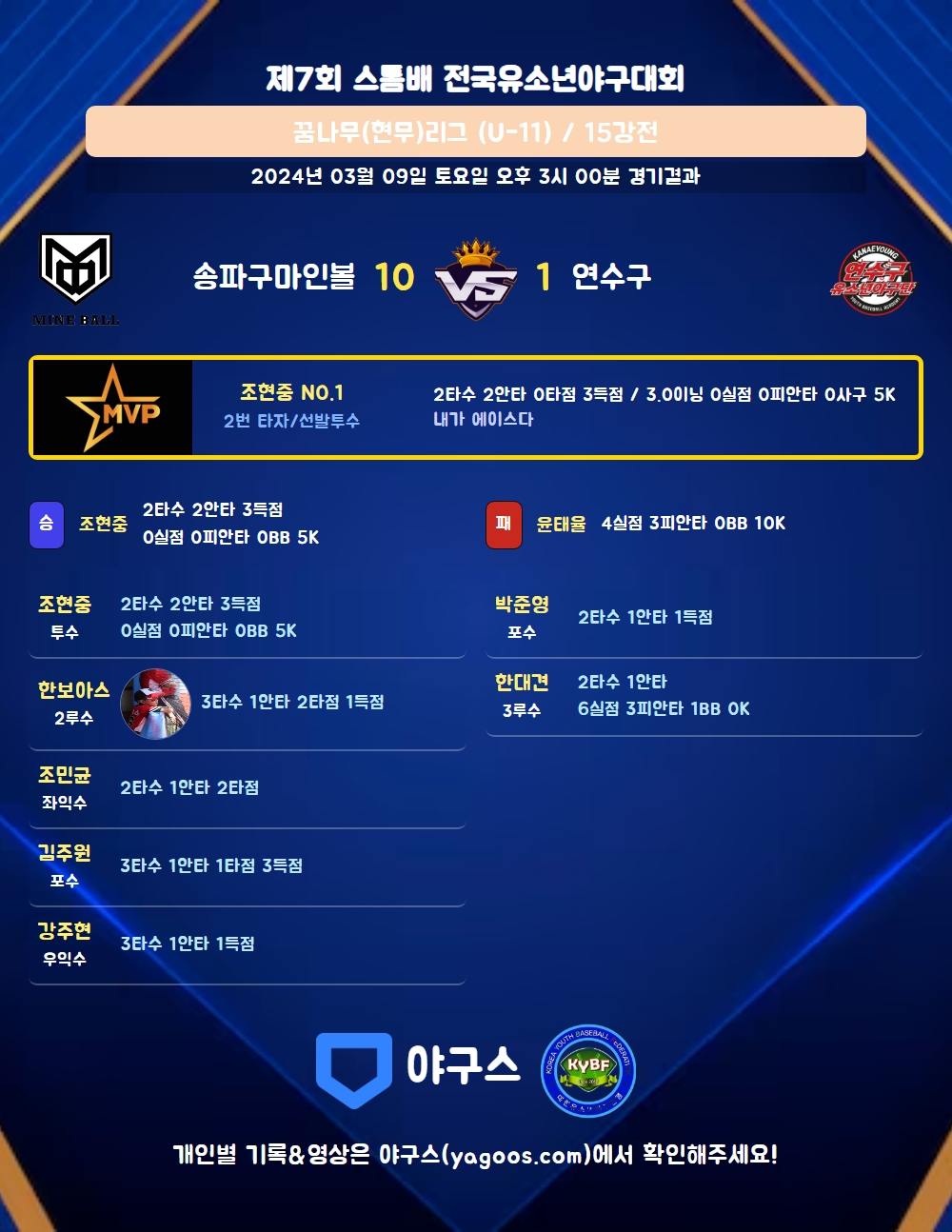 | 1 | 조현중(1) | 승 | - | 10 | 0 | 0 | 0 | - | 5 | 32 | 0 | 0 | 0.00 |
