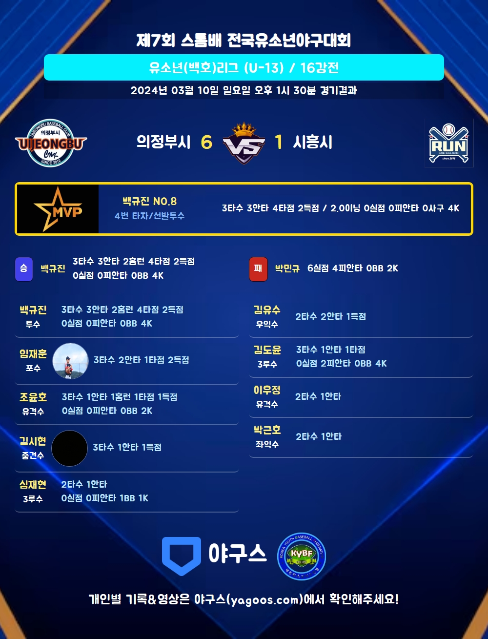 | 1 | 백규진(8) | 승 | - | 6 | 0 | 0 | 0 | - | 4 | 20 | 0 | 0 | 0.00 |
