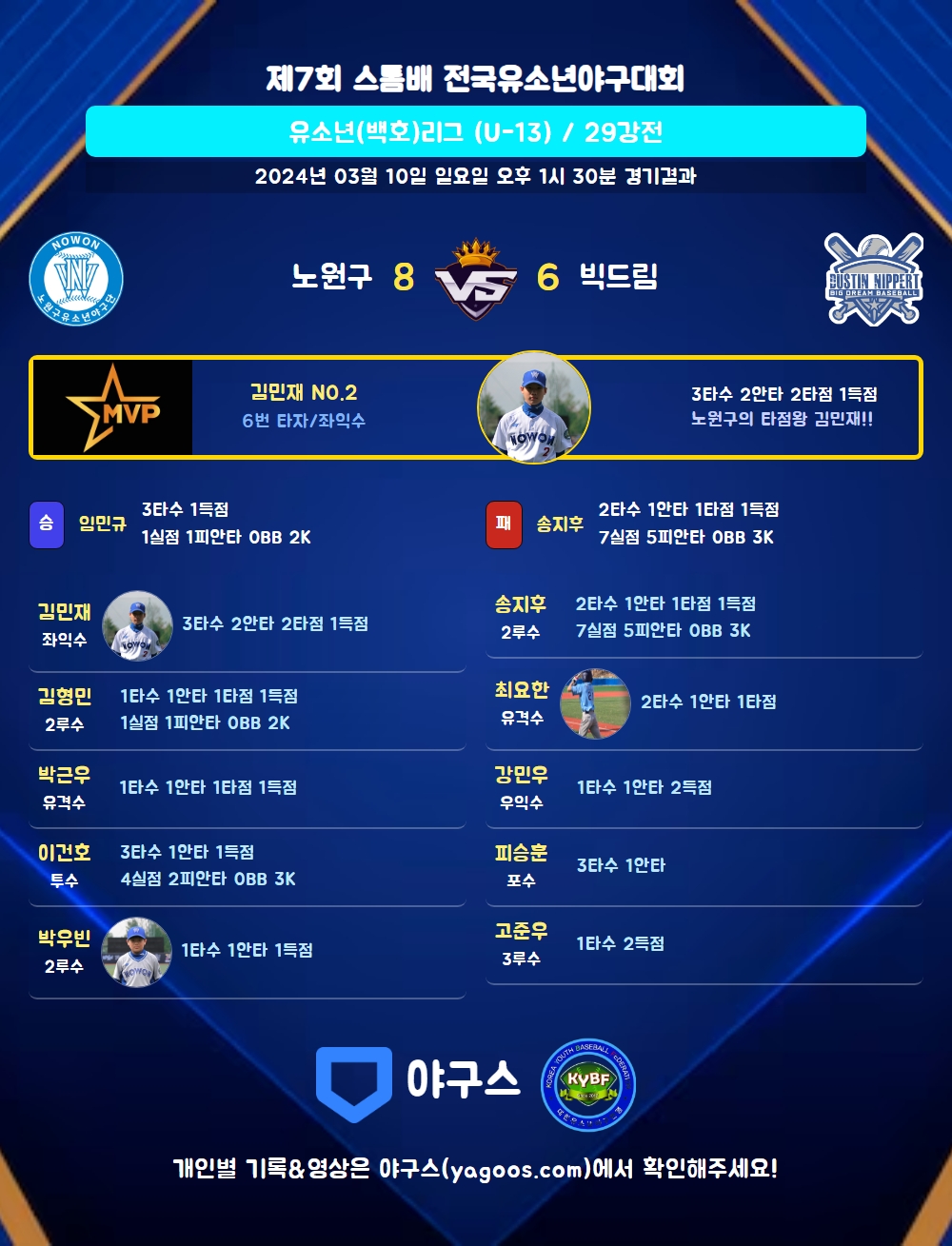 | 7 | 포 | 박민서(13) | - | 유플 | - | 4구 | - | 1 | 0 | 0 | 1 | 0 | 1 | 1 | 0 | 0.000 |