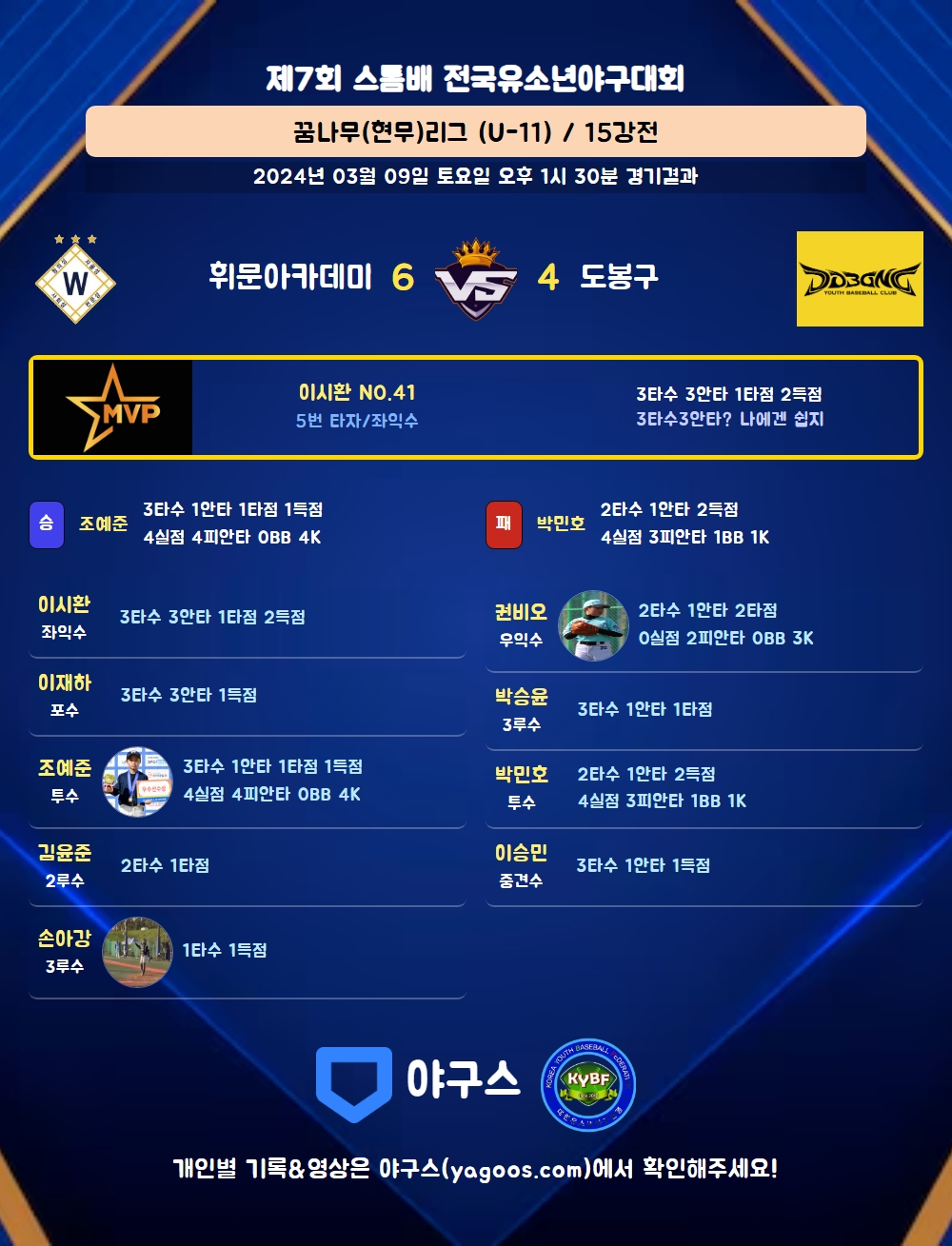 | 1 | 조예준(8) | 승 | - | 15 | 4 | 4 | 0 | 3 | 4 | 56 | 4 | 4 | 666.00 |