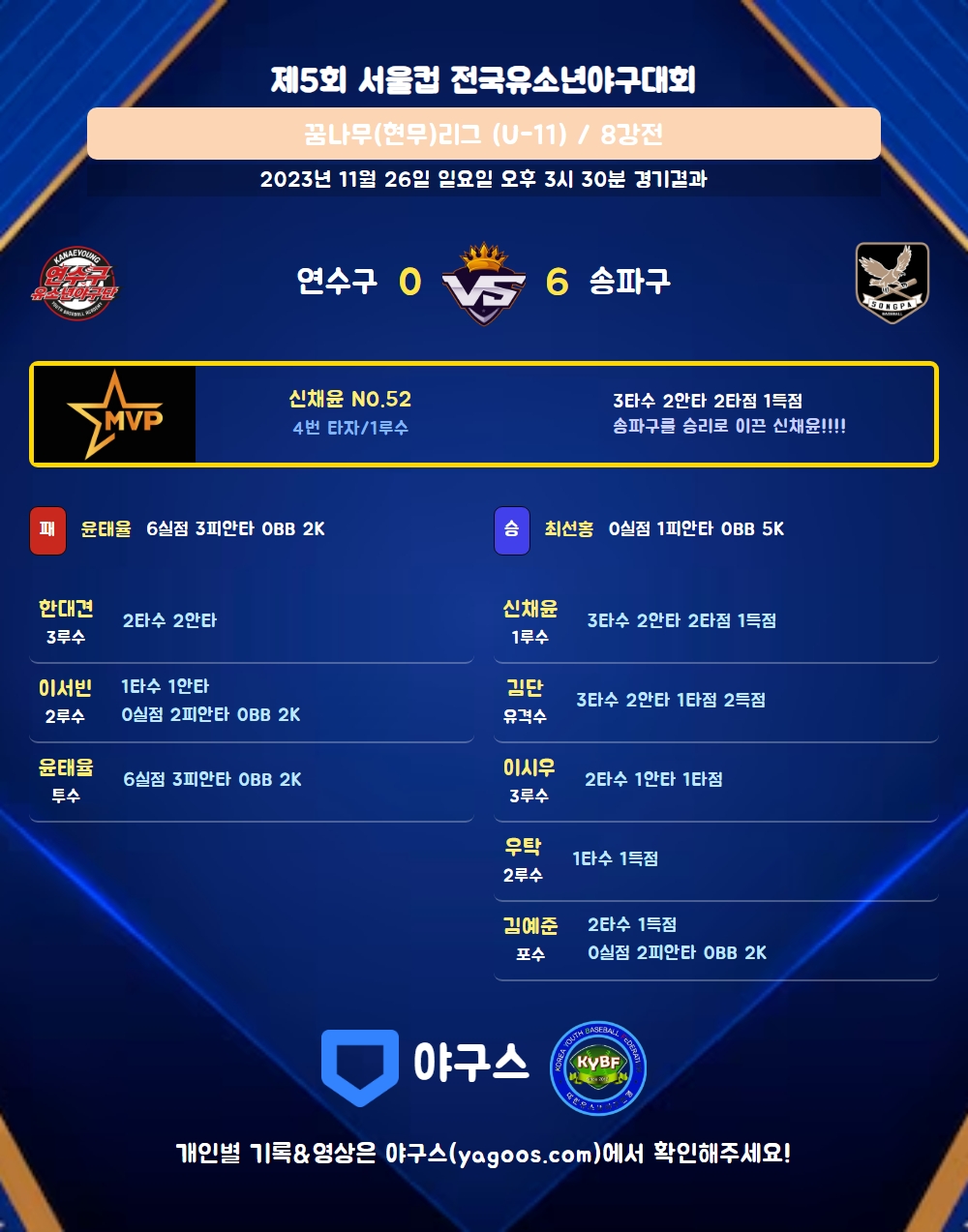 | 1 | 윤태율(7) | 패 | - | 11 | 3 | 3 | 0 | 2 | 2 | 40 | 6 | 6 | 0 |