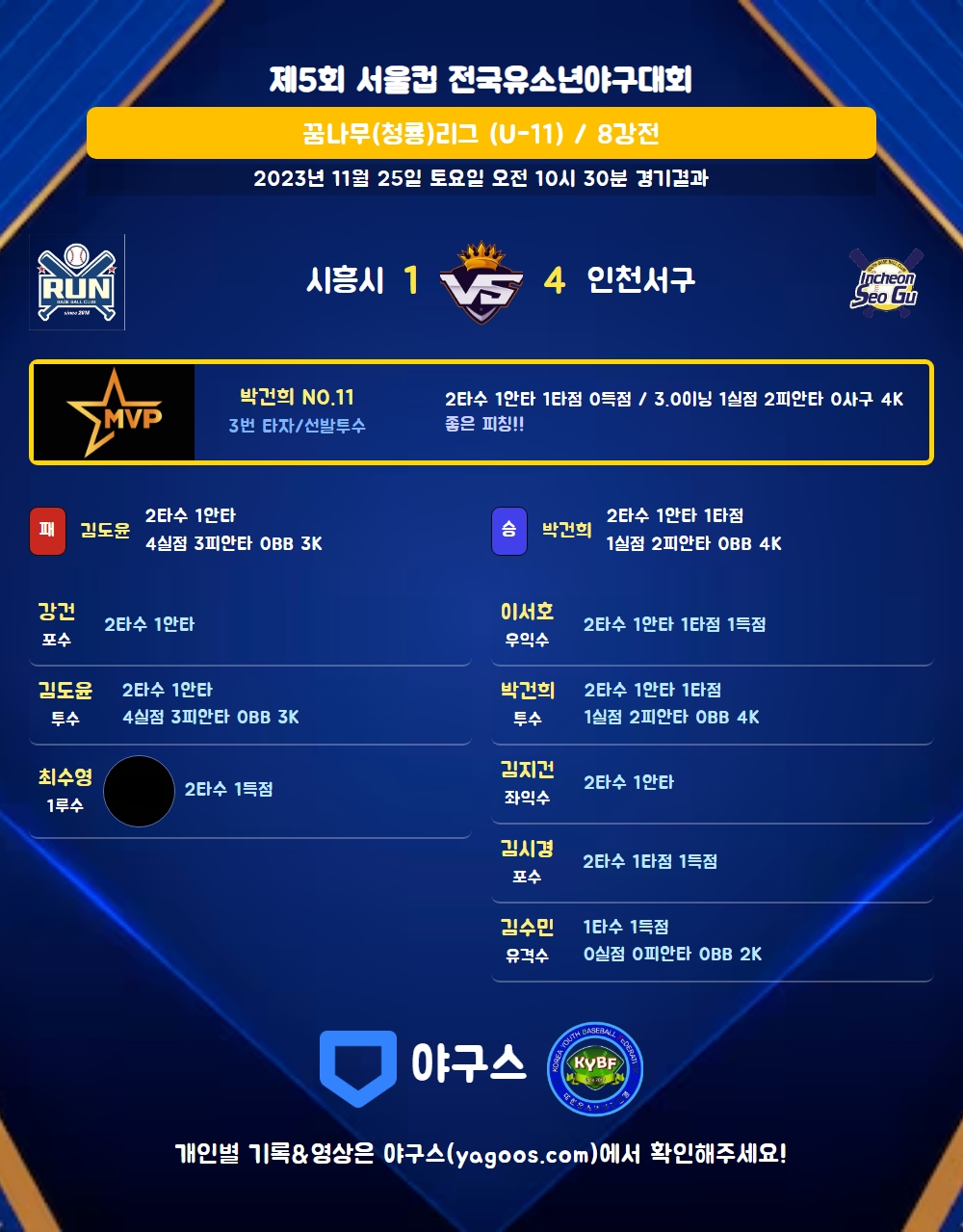 | 1 | 박건희(11) | 승 | - | 12 | 2 | 2 | 0 | 1 | 4 | 51 | 1 | 1 | 0 |