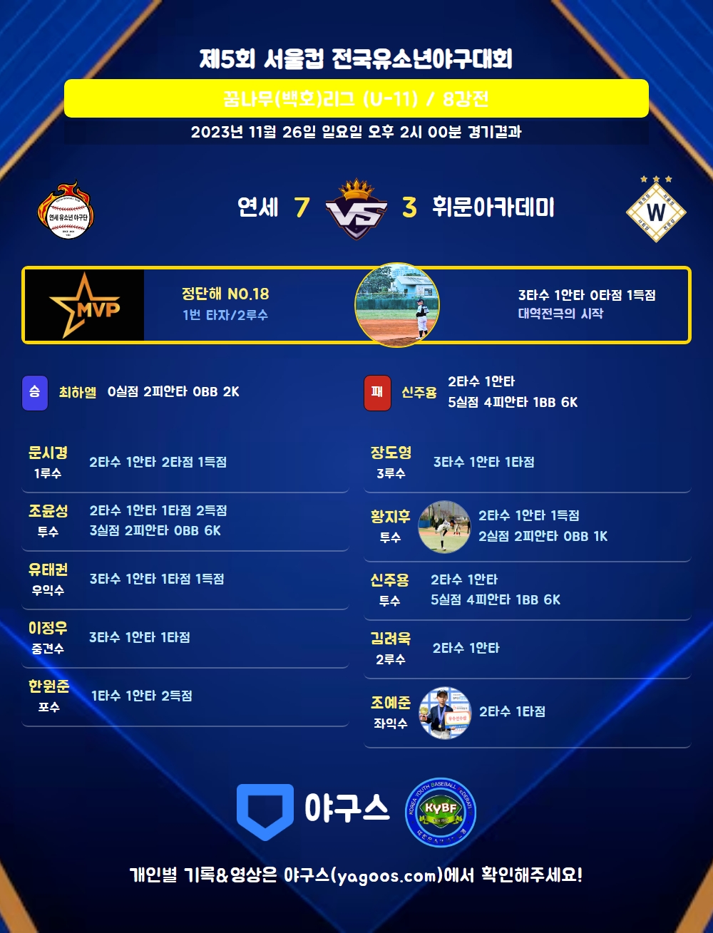 | 휘문아카데미 | 2 | 0 | 1 | 0 | 0 | 3 | 4 | 3 | 4 |