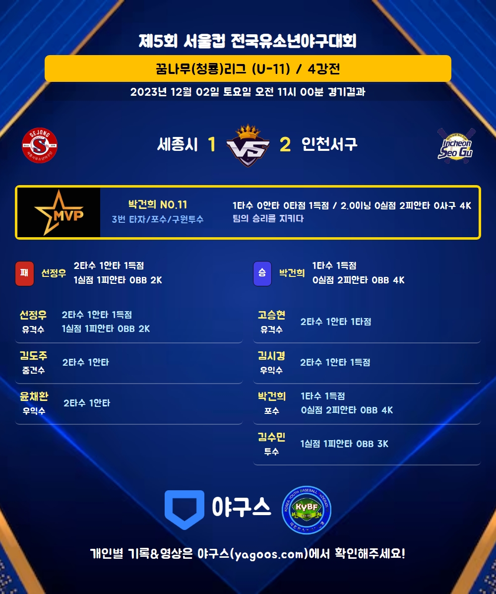 | 2 | 박건희(11) | 승 | - | 7 | 2 | 2 | 0 | - | 4 | 26 | 0 | 0 | 0 |
