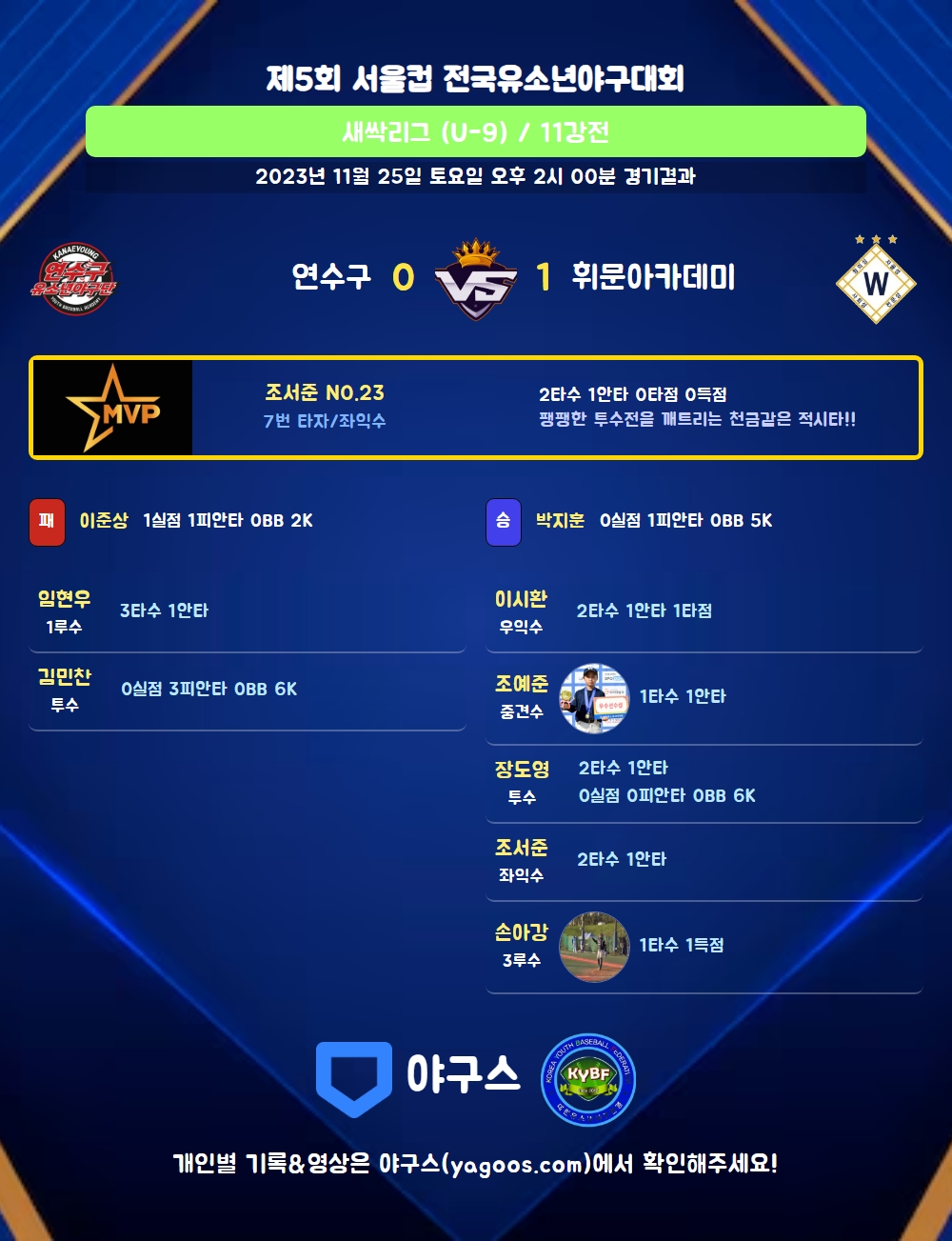 | 7 | 좌 | 조서준(23) | - | 삼진 | - | 우전안 | - | 2 | 1 | 0 | 0 | 0 | 0 | - | 1 | 0.500 |