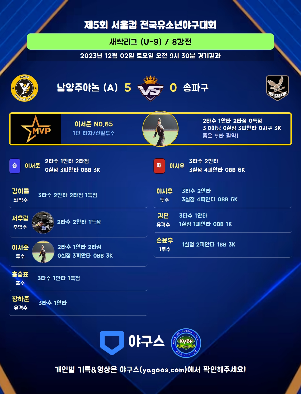 | 1 | 투 | 이서준(65) | 삼진 | 유내2 | - | 4구 | - | - | 2 | 1 | 2 | 0 | 0 | 0 | 1 | 1 | 0.500 |