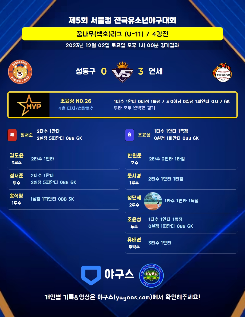 | 3 | 三 | 김도윤(11) | 유땅 | - | - | 좌선안 | - | 2 | 1 | 0 | 0 | 0 | 0 | - | 0 | 0.500 |