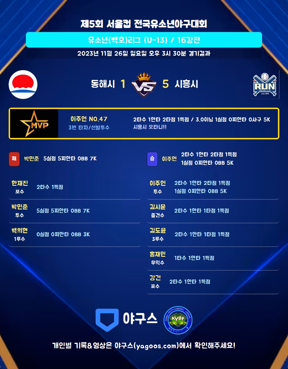 | 1 | 박민준(36) | 패 | - | 16 | 7 | 5 | 0 | 1 | 7 | 72 | 5 | 5 | 0 |