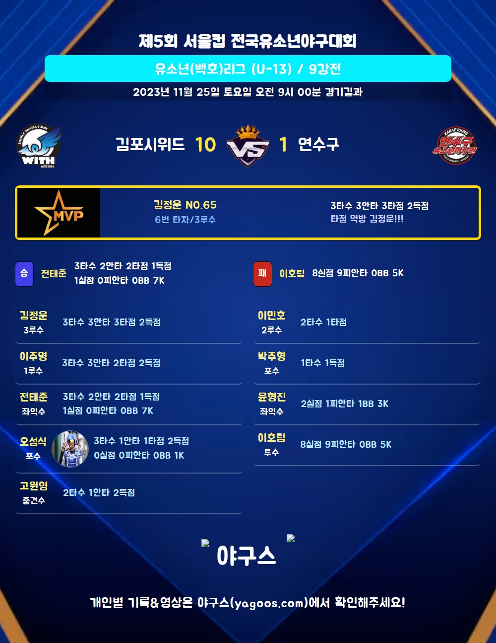 | 2 | 전태준(12) | 승 | - | 11 | 0 | 0 | 0 | 3 | 7 | 54 | 1 | 1 | 0 |