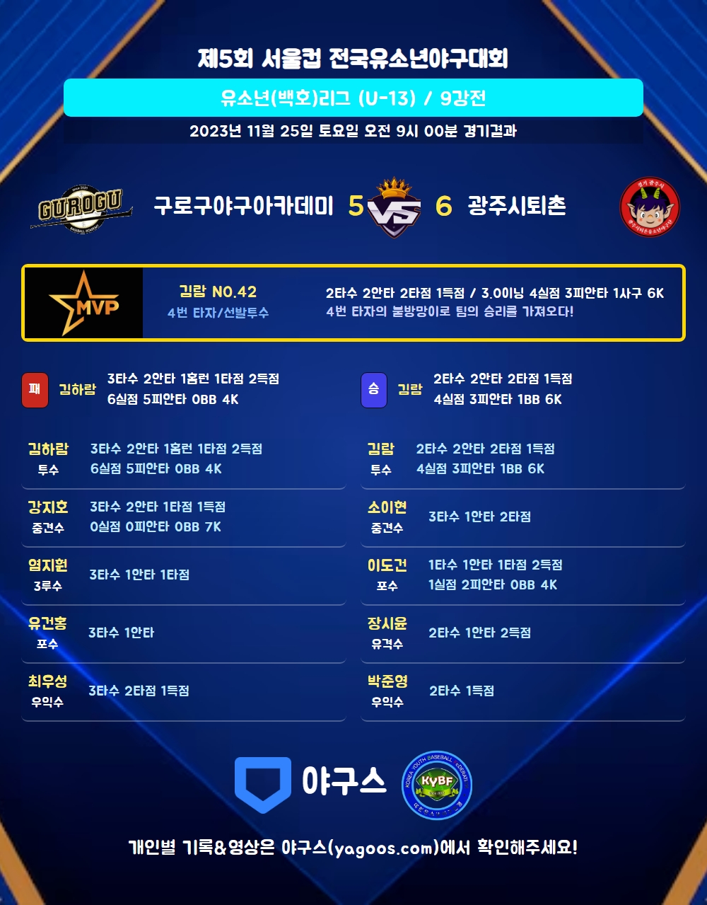 | 구로구야구아카데미 | 4 | 0 | 0 | 0 | 1 | 5 | 6 | 2 | 2 | |