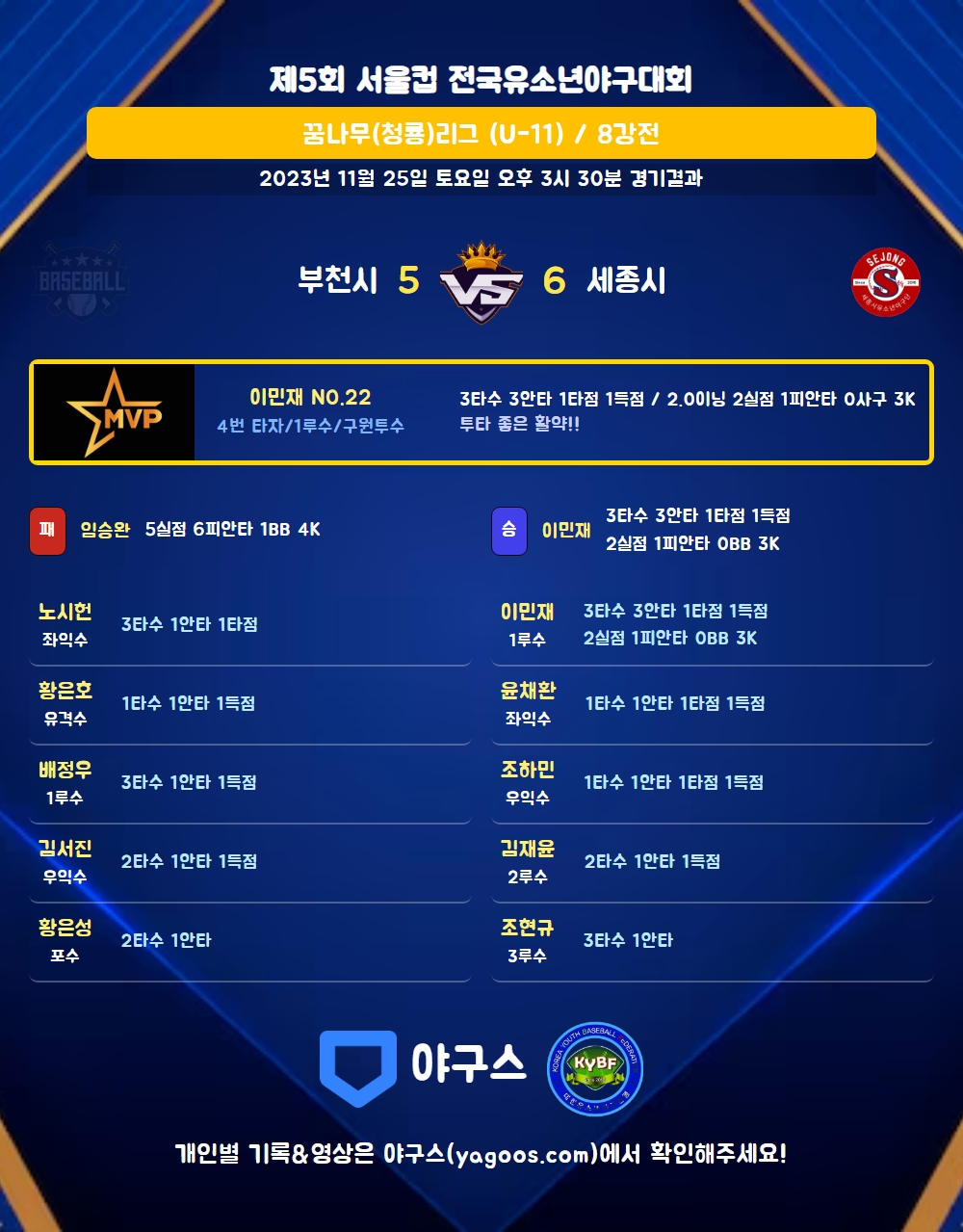 | 2 | 이민재(22) | 승 | - | 12 | 1 | 1 | 0 | 5 | 3 | 51 | 2 | 2 | 0 |