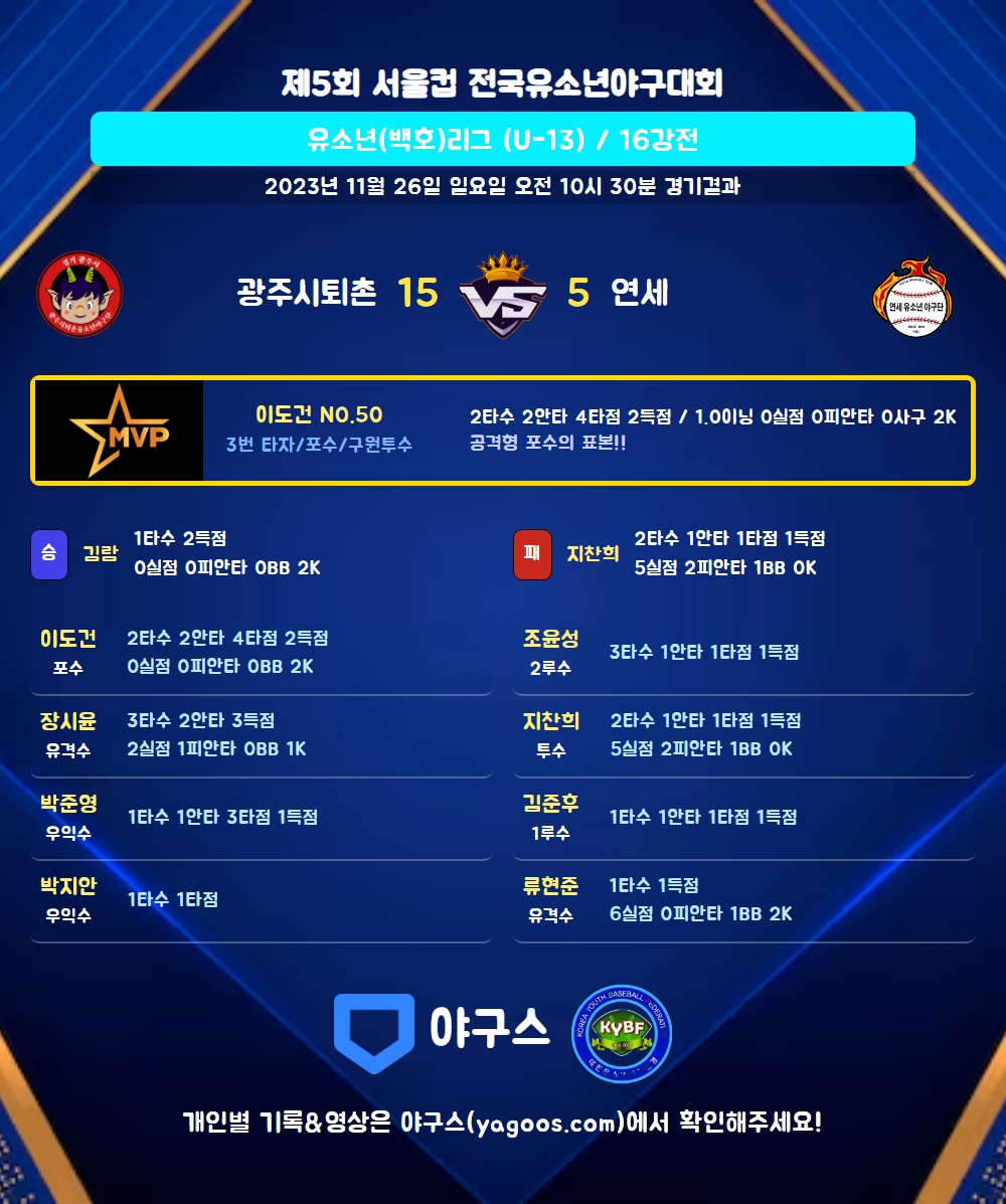 | 1 | 지찬희(15) | 패 | - | 5 | 2 | 2 | 0 | 3 | 0 | 23 | 5 | 5 | 0 |