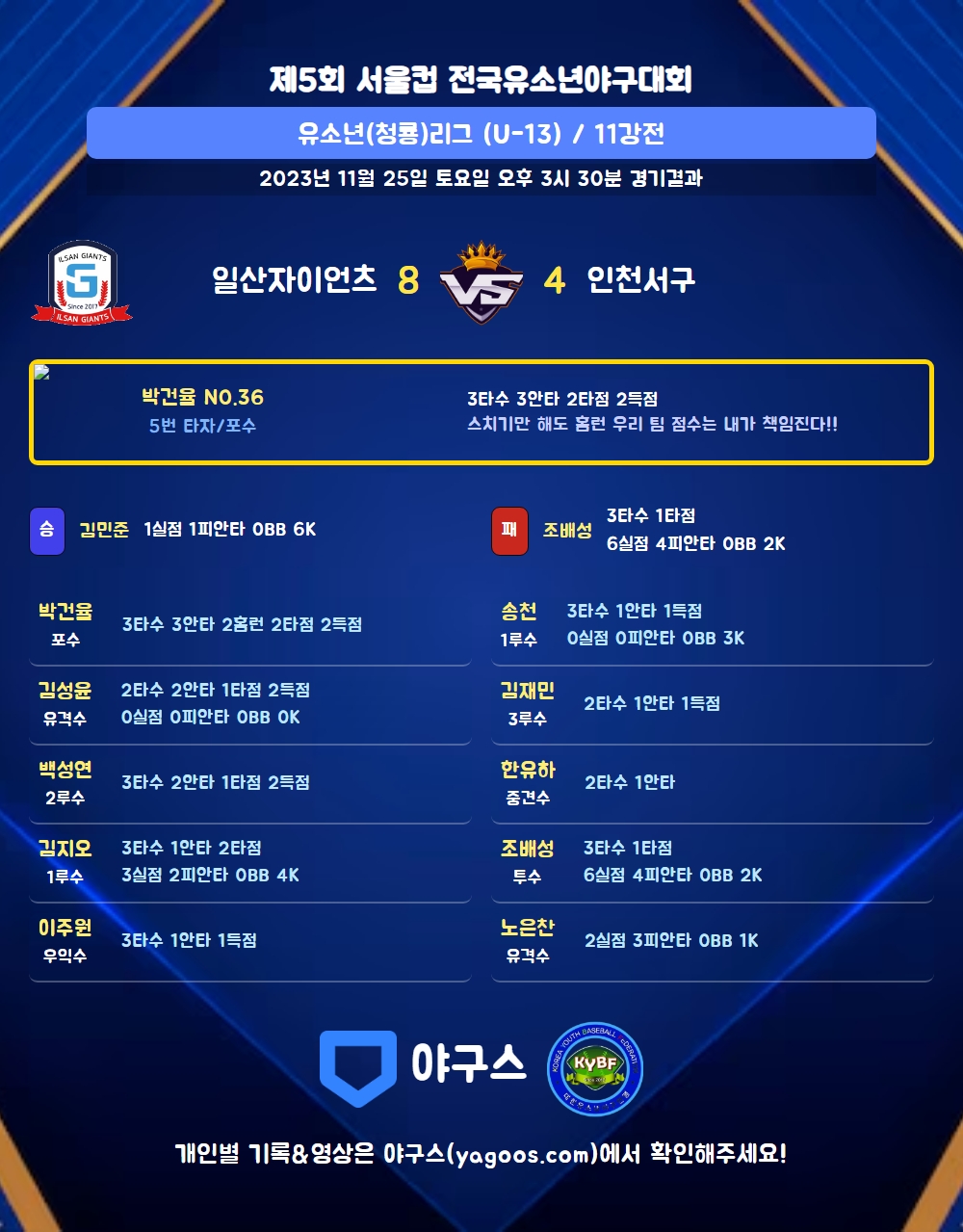 | 5 | 포 | 박건율(36) | - | 좌G홈런 | 우중G홈런 | - | 좌전안 | 3 | 3 | 2 | 2 | 2 | 0 | - | 0 | 1.000 |