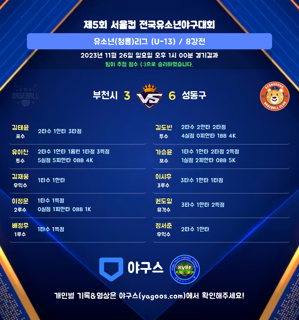 | 5 | 三 | 이시우(23) | 우전안 | 투땅 | - | 유플 | 3 | 1 | 1 | 0 | 0 | 0 | - | 0 | 0.333 |