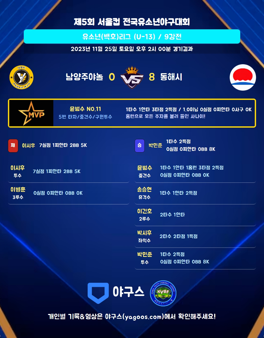 | 1 | 박민준(36) | 승 | - | 9 | 0 | 0 | 0 | - | 8 | 45 | 0 | 0 | 0 |