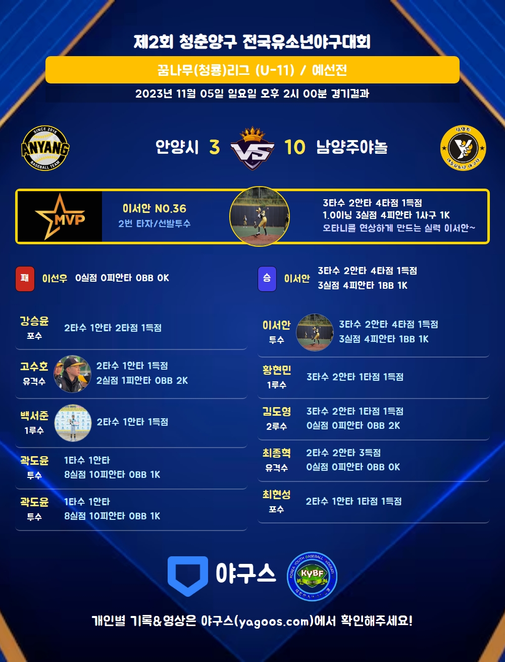 | 5 | 투 | 곽도윤(32) | 2내안 | - | - | 4구 | 1 | 1 | 0 | 0 | 0 | 0 | 1 | 0 | 1.000 |