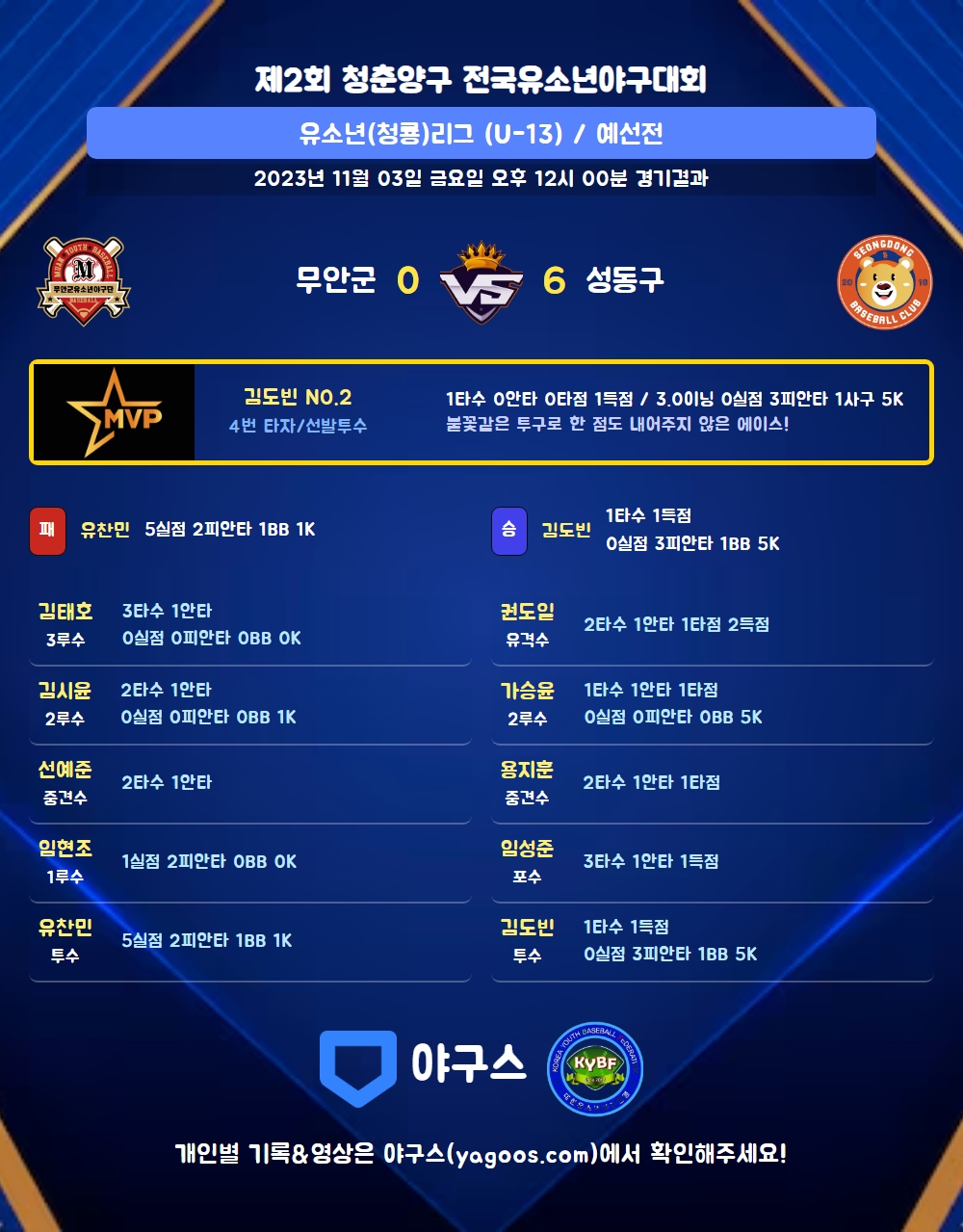| 6 | 二 | 김시윤(11) | - | 우중안 | - | 2실 | - | 2 | 1 | 0 | 0 | 0 | 1 | - | 0 | 0.500 |