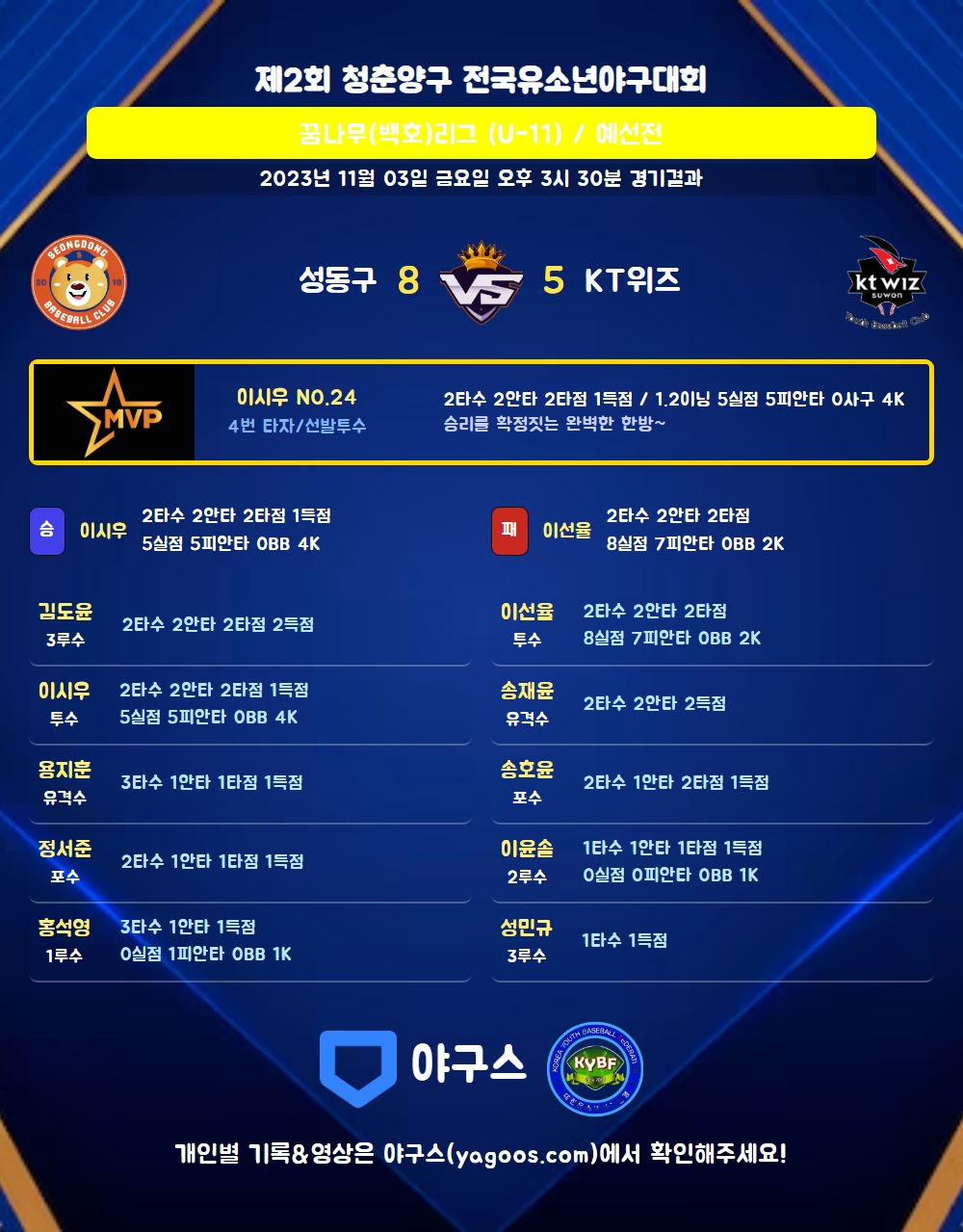 | 3 | 三 | 김도윤(11) | 중월2 | 좌월2 | - | 2 | 2 | 2 | 2 | 0 | 1 | - | 0 | 1.000 |