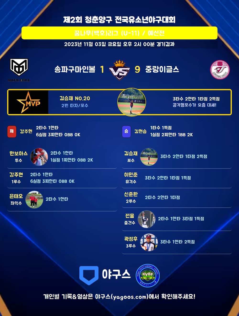 | 3 | 유 | 이민준(8) | 유플 | - | 우전3 | 중전안 | 3 | 2 | 1 | 1 | 0 | 0 | - | 0 | 0.667 |