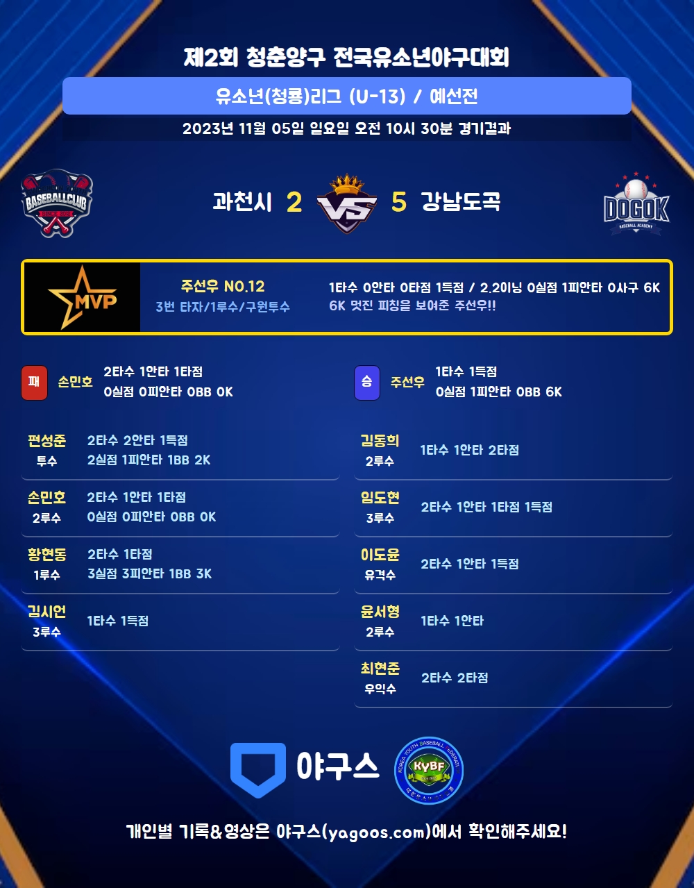 | 2 | 주선우(12) | 승 | - | 9 | 15 | 1 | 0 | - | 6 | 40 | 0 | 0 | 0 |