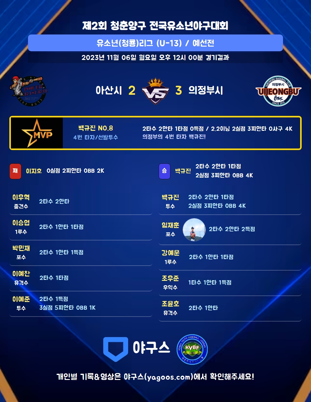 | 4 | 투 | 백규진(8) | 우전안 | - | 중전2 | - | 2 | 2 | 1 | 0 | 0 | 0 | - | 0 | 1.000 |