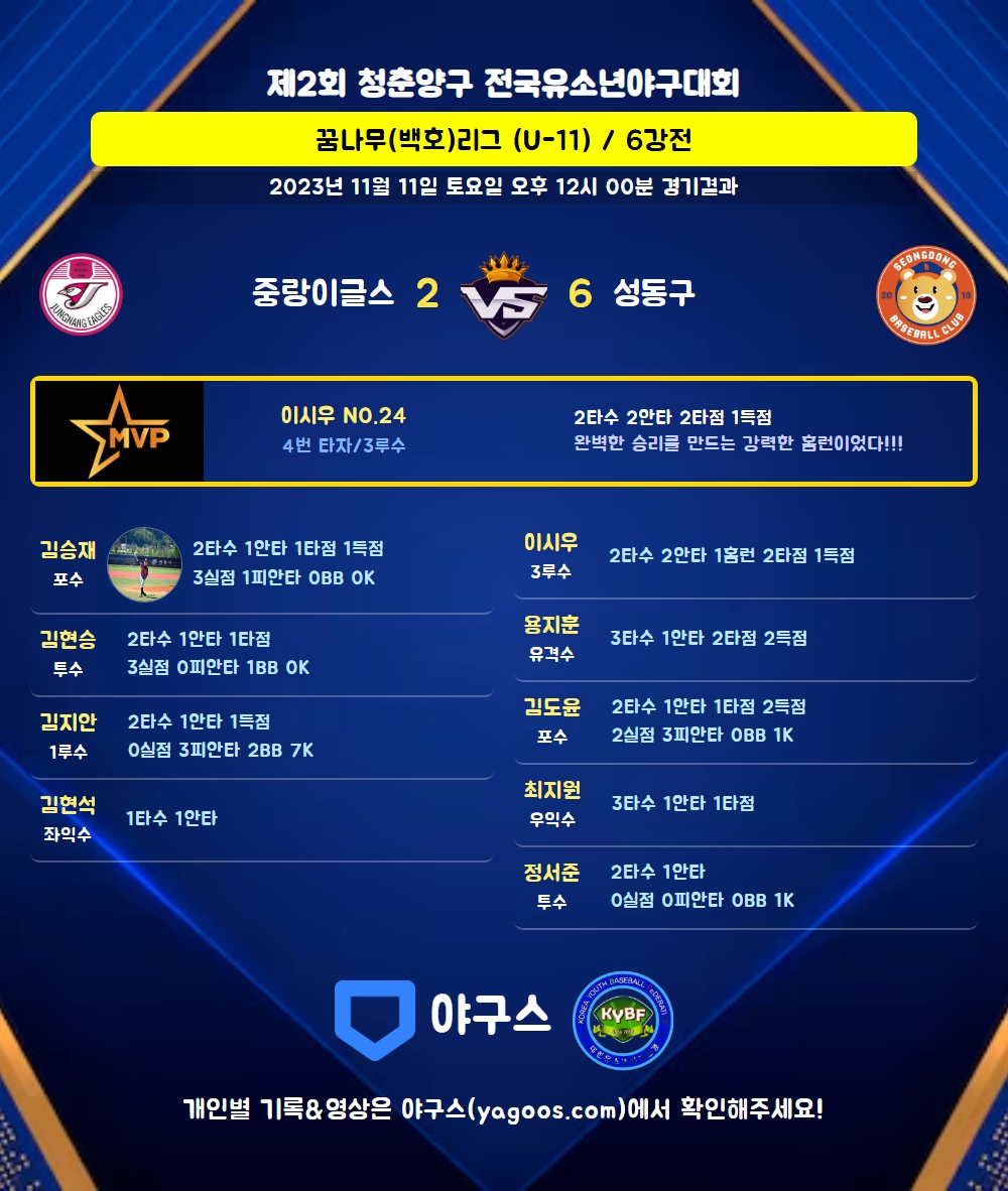| 3 | 포 | 김도윤(11) | 4구 | 삼진(낫아웃) | - | 우선3 | 2 | 1 | 1 | 2 | 0 | 0 | 1 | 1 | 0.500 |