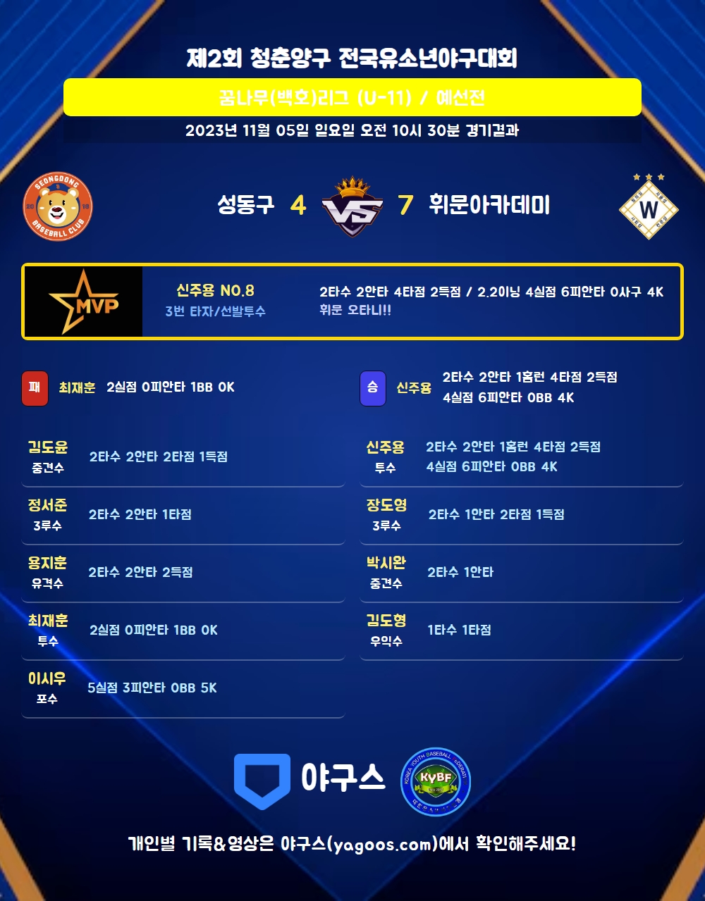 | 3 | 중 | 김도윤(11) | 2내안 | - | 중월2 | 2 | 2 | 2 | 1 | 0 | 0 | - | 0 | 1.000 |