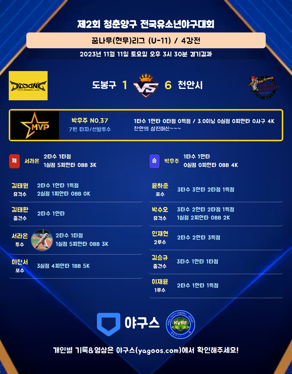 | 1 | 박우주(37) | 승 | - | 9 | 0 | 0 | 0 | - | 4 | 33 | 0 | 0 | 0 |