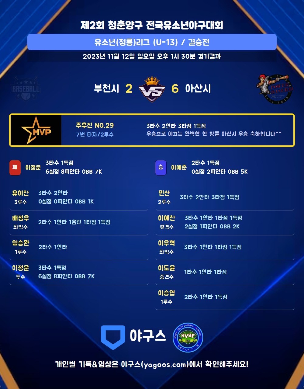 | 1 | 이예준(9) | 승 | - | 12 | 2 | 2 | 0 | 1 | 5 | 38 | 0 | 0 | 0 |