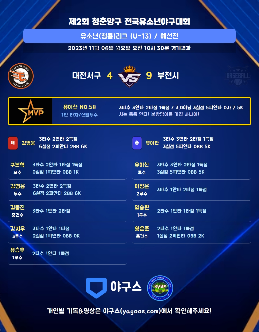 | 1 | 유이찬(58) | 승 | - | 14 | 5 | 5 | 0 | - | 5 | 46 | 3 | 3 | 0 |