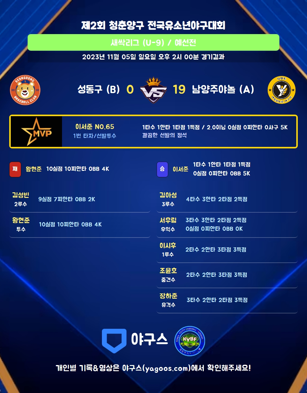 | 1 | 투 | 이서준(65) | 4구 | 유내안 | - | 1 | 1 | 1 | 1 | 0 | 0 | 1 | 0 | 1.000 |
