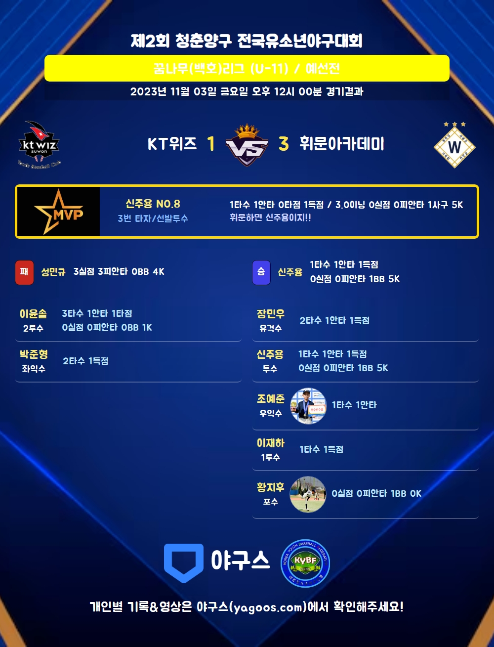 | 1 | 신주용(8) | 승 | - | 12 | 0 | 0 | 0 | 3 | 5 | 59 | 0 | 0 | 0 |