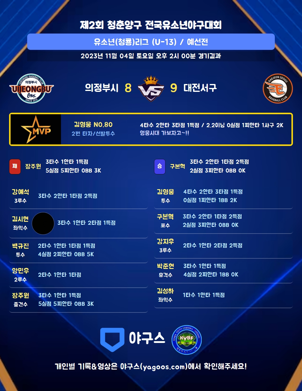 | 2 | 투 | 김영웅(80) | 삼진 | - | 좌전안,좌전안 | - | 투실 | 4 | 2 | 3 | 1 | 0 | 0 | - | 1 | 0.500 |