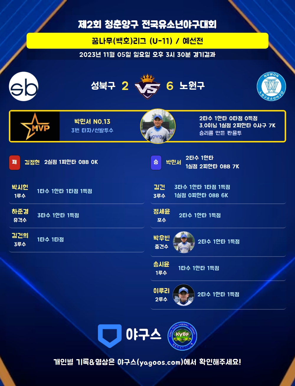 | 1 | 박민서(13) | 승 | - | 11 | 2 | 2 | 0 | 1 | 7 | 43 | 1 | 1 | 0 |