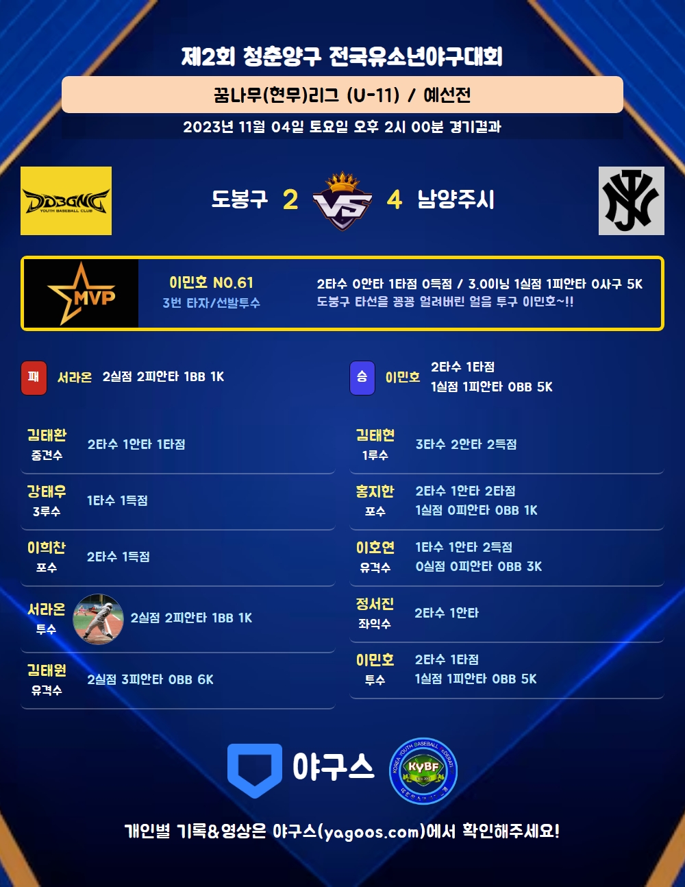 | 3 | 투 | 이민호(61) | 1땅 | - | 삼진 | - | - | 2 | 0 | 1 | 0 | 0 | 0 | - | 1 | 0.000 |