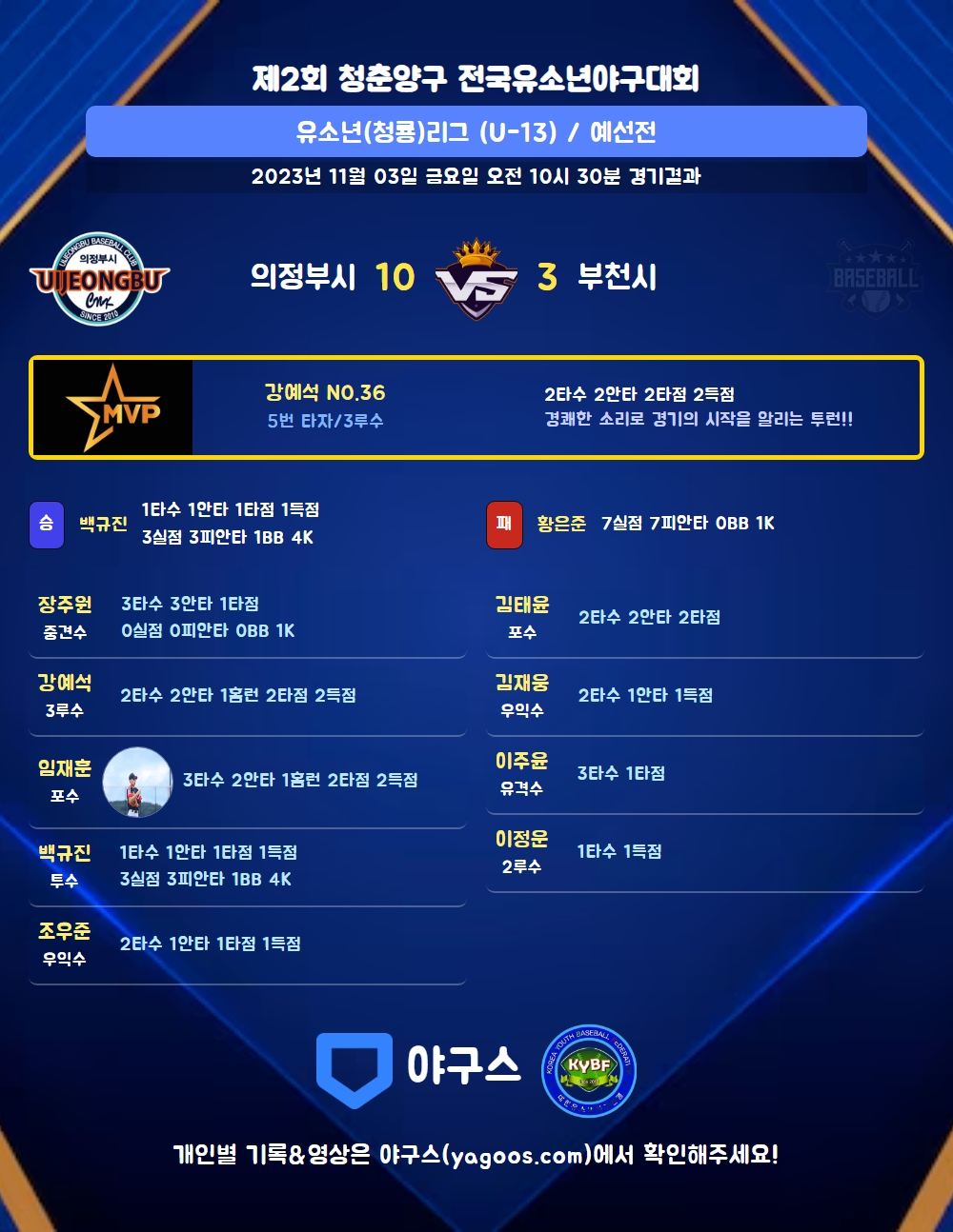 | 2 | 一 | 유이찬(58) | 1땅 | 좌플 | - | 삼진 | 3 | 0 | 0 | 0 | 0 | 0 | - | 1 | 0.000 |